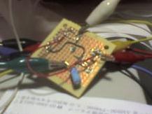 今回作成した回路の裏側です。何度も カットアンドトライを繰り返した結果、裏 にも部品がついてしまいました。 2007年10月14日撮影